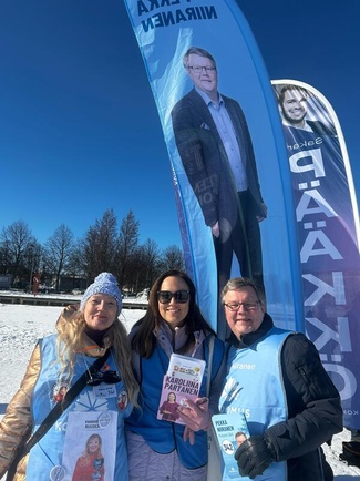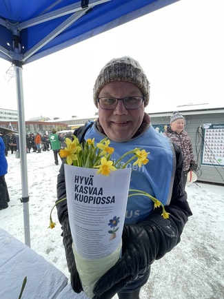 ![]() Kokoomus jakoi lauantaina Kuopion torilla 750 narsissia. Yksi kukan saaneista oli Ilkka Raninen. | ![]() Pekka pääsi kampanjoimaan mukavassa seurassa taas perjantaina, kun työviikko oli takana. |