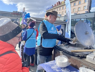 ![]() Pekka kampanjoi sunnuntaina 6.4. Valkeisenlammen rannalla, jossa kokoomus tarjosi vaalimakkaraa. Keskustelukavereita riitti, ja aika sujui siksi kuin siivillä. | ![]() Ruispuuro maistui lauantaina torilla kuopiolaisille. Kokkina toimi kokoomuksen valtuustoryhmän puheenjohtaja Jukka Savolainen. |