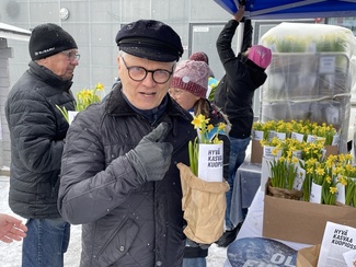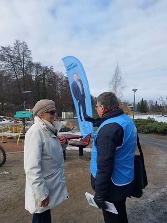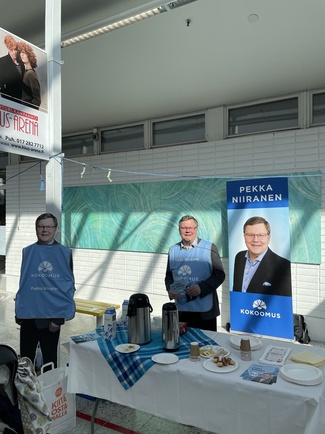 ![]() Kokoomus jakoi lauantaina Kuopion torilla 750 narsissia. Yksi kukan saaneista oli Ilkka Raninen. | ![]() Pekka pääsi kampanjoimaan mukavassa seurassa taas perjantaina, kun työviikko oli takana. |