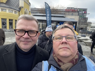![]() Pahvi-Pekka oli mukana ensimmäistä kertaa näissä vaaleissa tiistaina 1.4. Puijonlaakson ostarilla, kun ehdokas-Pekka tarjosi kahvia. Paikalla pyörähti kiitettävä määrä juttukavereita. | ![]() Pääministeri Petteri Orpo vieraili Kuopion torilla lauantaina 29.3. Pekka on tavannut Orpon ensimmäisen kerran jo silloin, kun tämä oli maa- ja metsätalousministeri. |