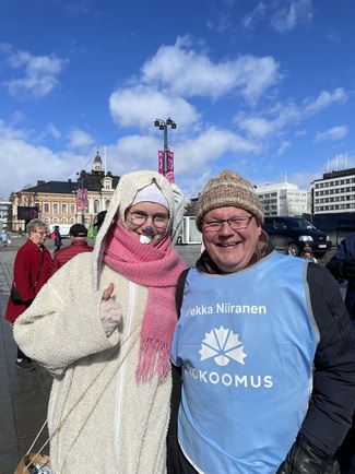 ![]() Saisiko olla kukka? Pekan vaalikampanja huipentui lauantaina Kuopion torille. Sunnuntaina sitten jännitetään vaalituloksia. | ![]() Vaalijänis ja Pekka tapasivat ihmisiä lauantaina torilla. Lumisade taukosi onneksi loppua kohti. |