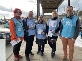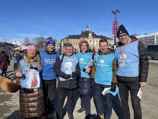 ![]() Aurinko suosi kampanjointia lauantaina 23.3. Kuopion satamassa. Kuvassa kova kolmikko Vuokko Hillevi, Karoliina ja Pekka. | ![]() Pekan beach flag oli Kuopion torilla vähän kallellaan, mutta onneksi oikeaan suuntaan. |