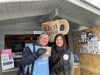 ![]() Eri puolueiden ehdokkaitten erinomaista yhteistyötä parhaimmillaan: kokoomus tarjosi perjantaina kahvia Kuopion torilla, mutta naapuriseuran mainio ehdokas Maigi Kuutsa tarjosi Pekalle sen kanssa nautittavaksi aamulla leipomansa voisilmäpullan! | ![]() Torstai päättyi Ykkösrastille, jossa Pekka, Eeva Mäkinen, Tiina Viljakainen, Elena Chiksoeva ja Teemu Soini tarjosivat kahvia. Muutama kertoi jo käyneensä äänestämässä erästä nimeltä mainitsematonta ehdokasta nimeltä Pekka. |